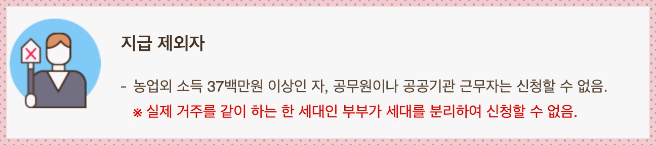 참고로, 축산과 양봉농가는 별도 조건이라는 점도 확인해주시면 되겠습니다. 앞서 말씀드렸다시피, 세부 기준은 지역별로 다르기 때문에 반드시 세세하게 잘 살펴보시기 바라며, 제외 대상도 확인해보겠습니다.