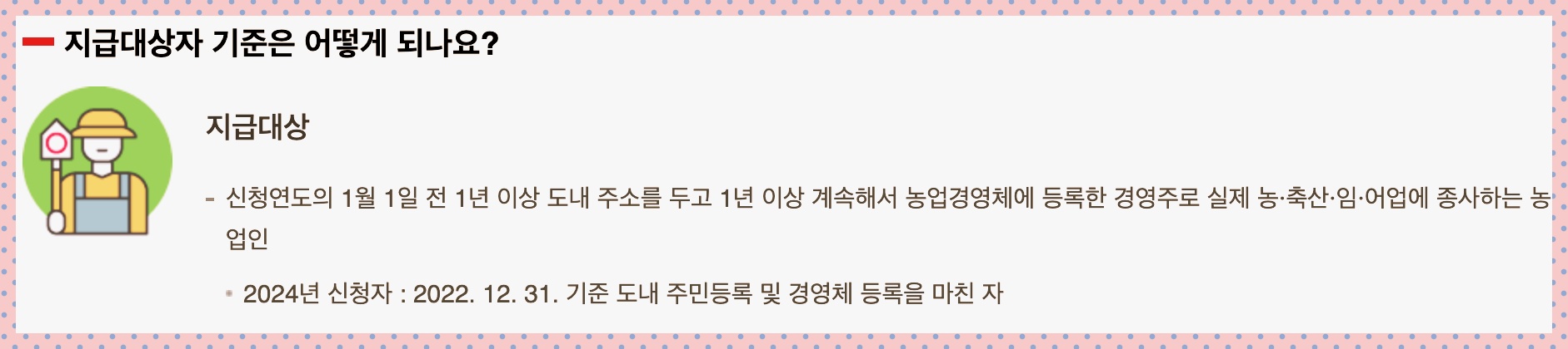 더욱이 명확하고 자세한 농민수당 자격을 확인하고 싶으시다면, 홈페이지를 참고해보셔도 좋을듯합니다.