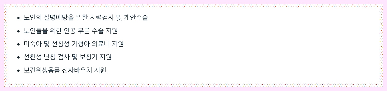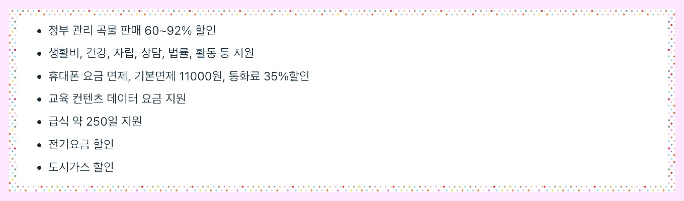 생계부분은 크게 위와 같은 혜택들이 줄비하고 있습니다. 이러한 혜택들도 더 자세한 부분은 홈페이지를 통해 확인해보시는것이 좋겠습니다. 사실 이 밖에 다른 생계부분 내용도 많지만 내용이 너무 많아 다 담지 못했습니다.