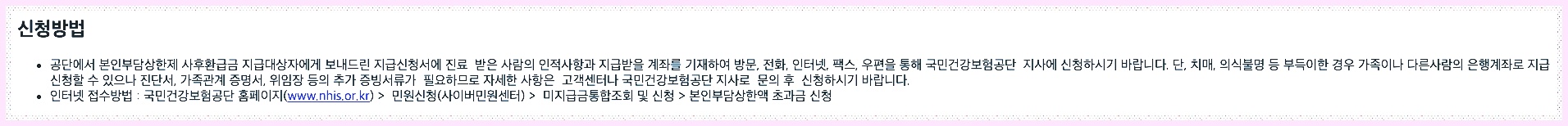 한도 신청 방법은 기관이 한도를 초과할 경우 개인 대신 정부가 부담하는 선청구와 기관에서 지급한 금액을 정부가 확인하고 환급하는 방법으로 나뉩니다.