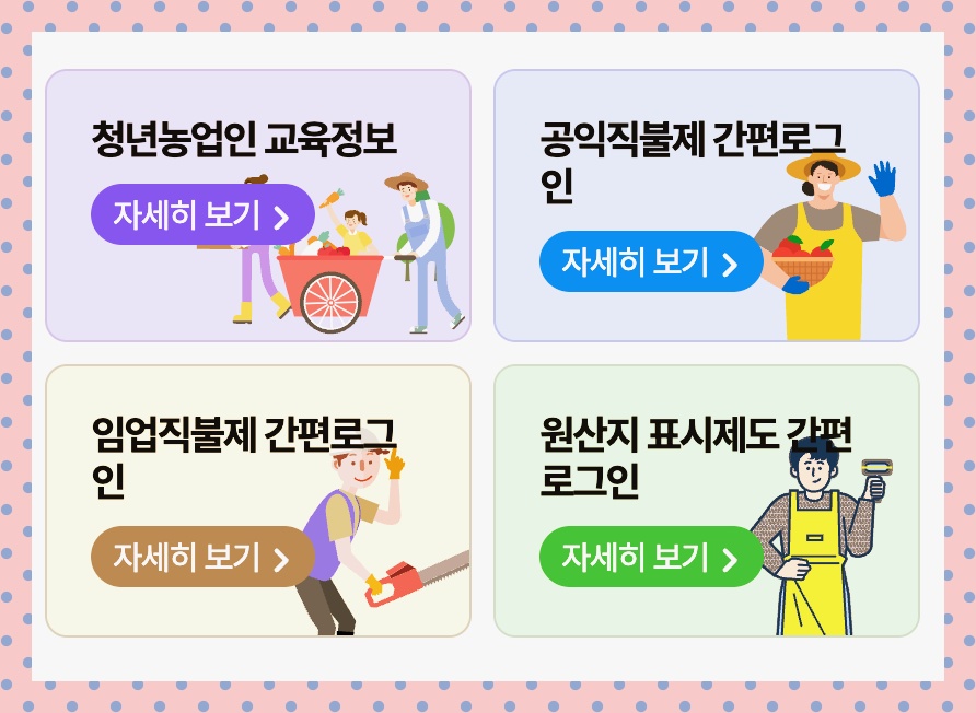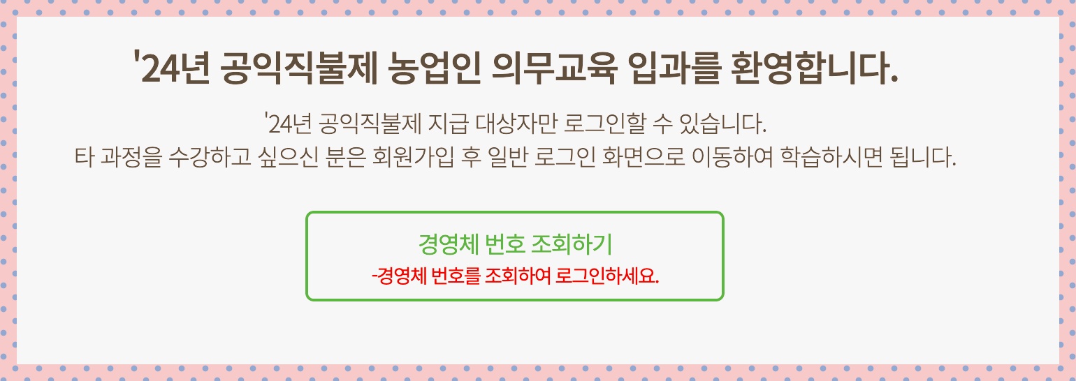 정부 측에서 운영하고 있는 농업교육포털 홈페이지에 접속하신 후 수강하는 방식입니다. 많이들 어려워하실 수 있는 로그인 방법은 농업경영체 등록번호 혹은 주민등록번호와 성함을 입력해주시면 곧바로 공익형직불금 이수교육을 수강하실 수 있겠습니다.